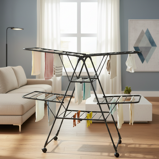 Séchoir à linge étendoir multifonction Grande Capacité avec roulettes 28M USHUAIA BLACK Couleur bois et noir avec Maille Etendoir