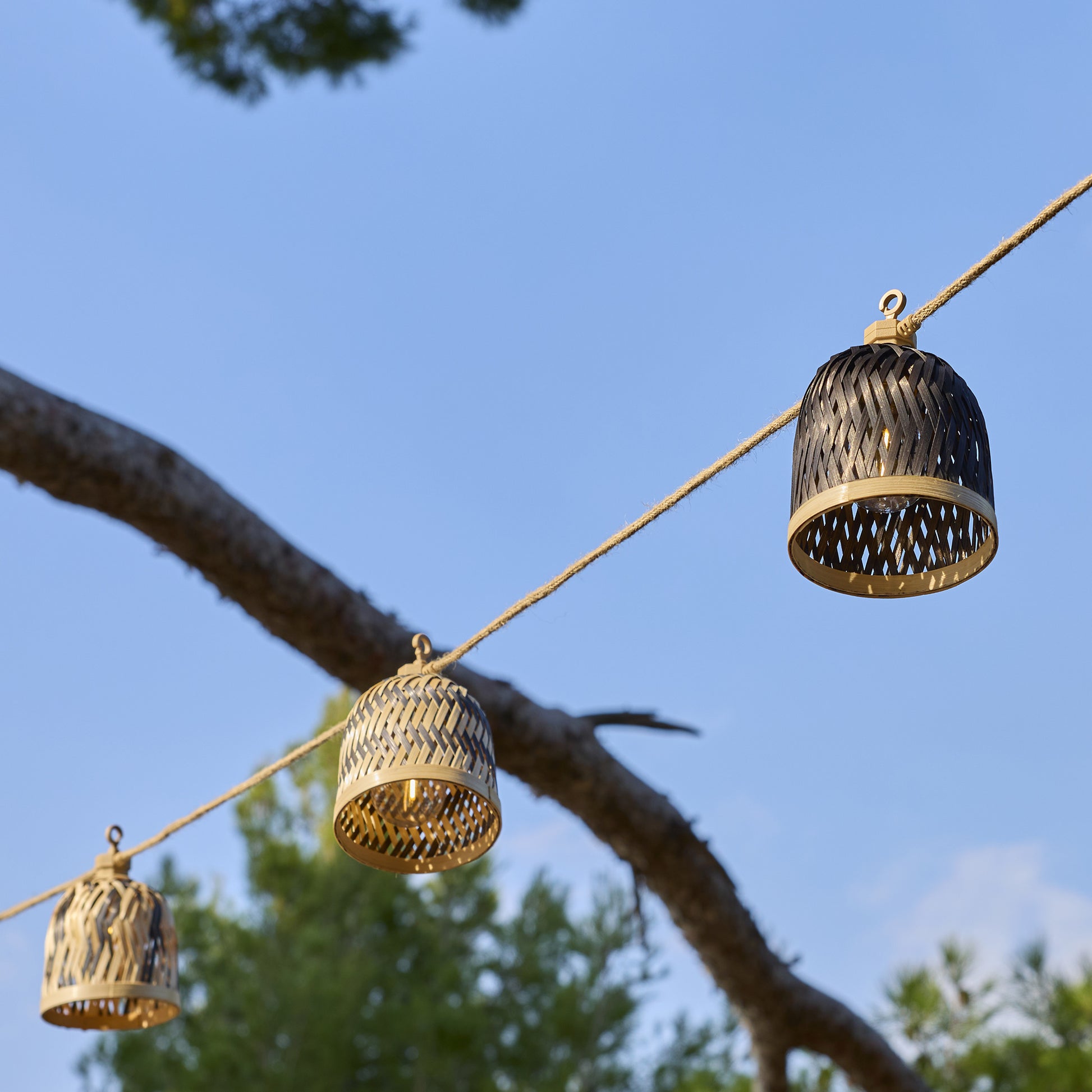 Guirlande lumineuse extérieur raccordable 10 abat-jour naturels en bambou LINA LIGHT HYBRID LED blanc chaud 8m solaire et sur secteur