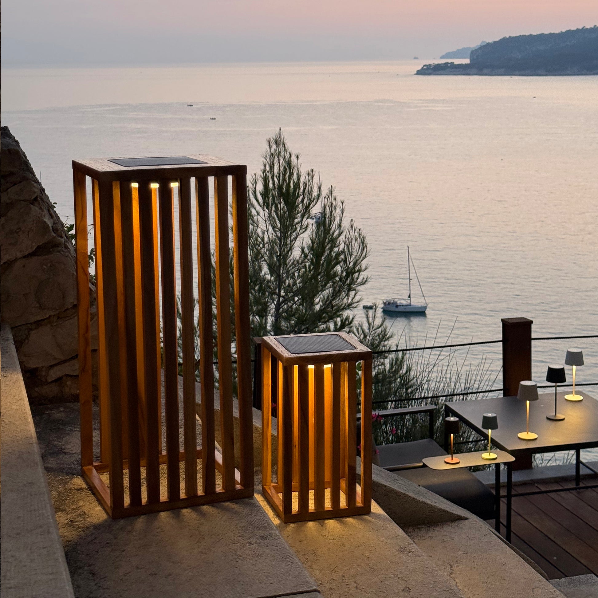 Lanterne solaire décorative LED blanc chaud CHENNAI en bois teck massif H30cm